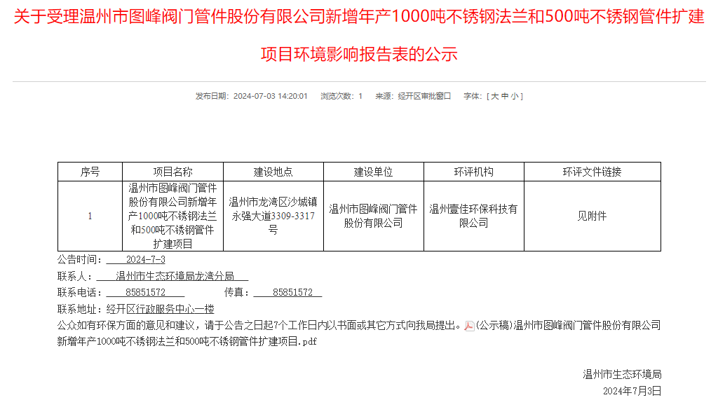 7月3日,溫州市生態環境局龍灣分局受理溫州市圖峰閥門管件股份有限公司新增年產1000噸不銹鋼法蘭和500噸不銹鋼管件擴建項目環境影響報告表并對外進行公示,公示期:7個工作日。