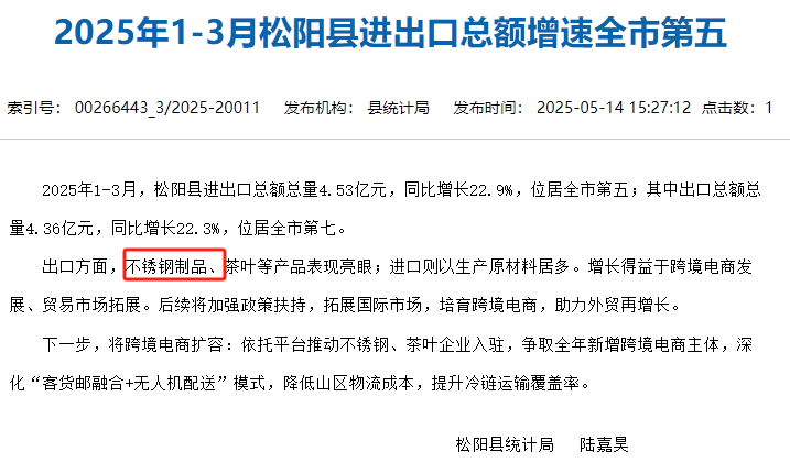 2025年5月14日,松陽縣統(tǒng)計(jì)局發(fā)布一文《2025年1-3月松陽縣進(jìn)出口總額增速全市第五》。