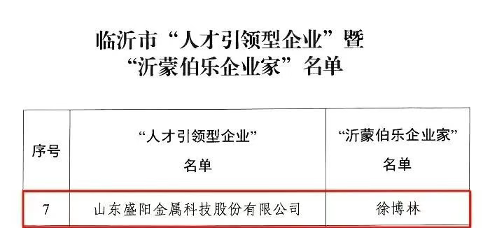 其中,山東盛陽金屬科技被評選為“人才引領型企業”,集團總裁徐博林被授予“沂蒙伯樂企業家”榮譽稱號。