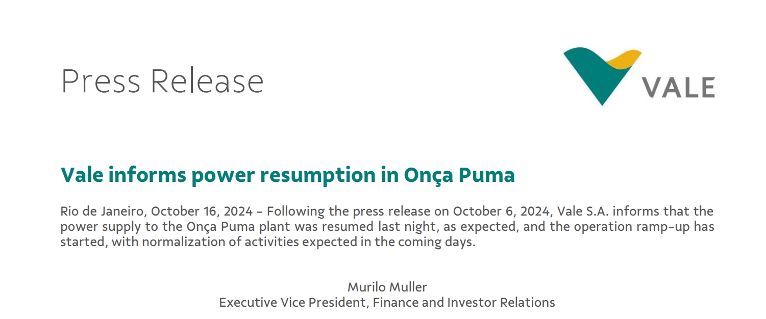據淡水河谷公司10月16日消息,Onca Puma工廠的供電已于10月15日恢復,目前生產爬坡工作已經開始,預計未來幾天內將恢復正常運營。