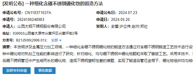 2024年7月23日,山西太鋼不銹鋼股份有限公司成功申請一項名為“一種細化含硼不銹鋼硼化物的鍛造方法”專利,申請公布號為CN118371637A,申請日期為2024年5月20日。